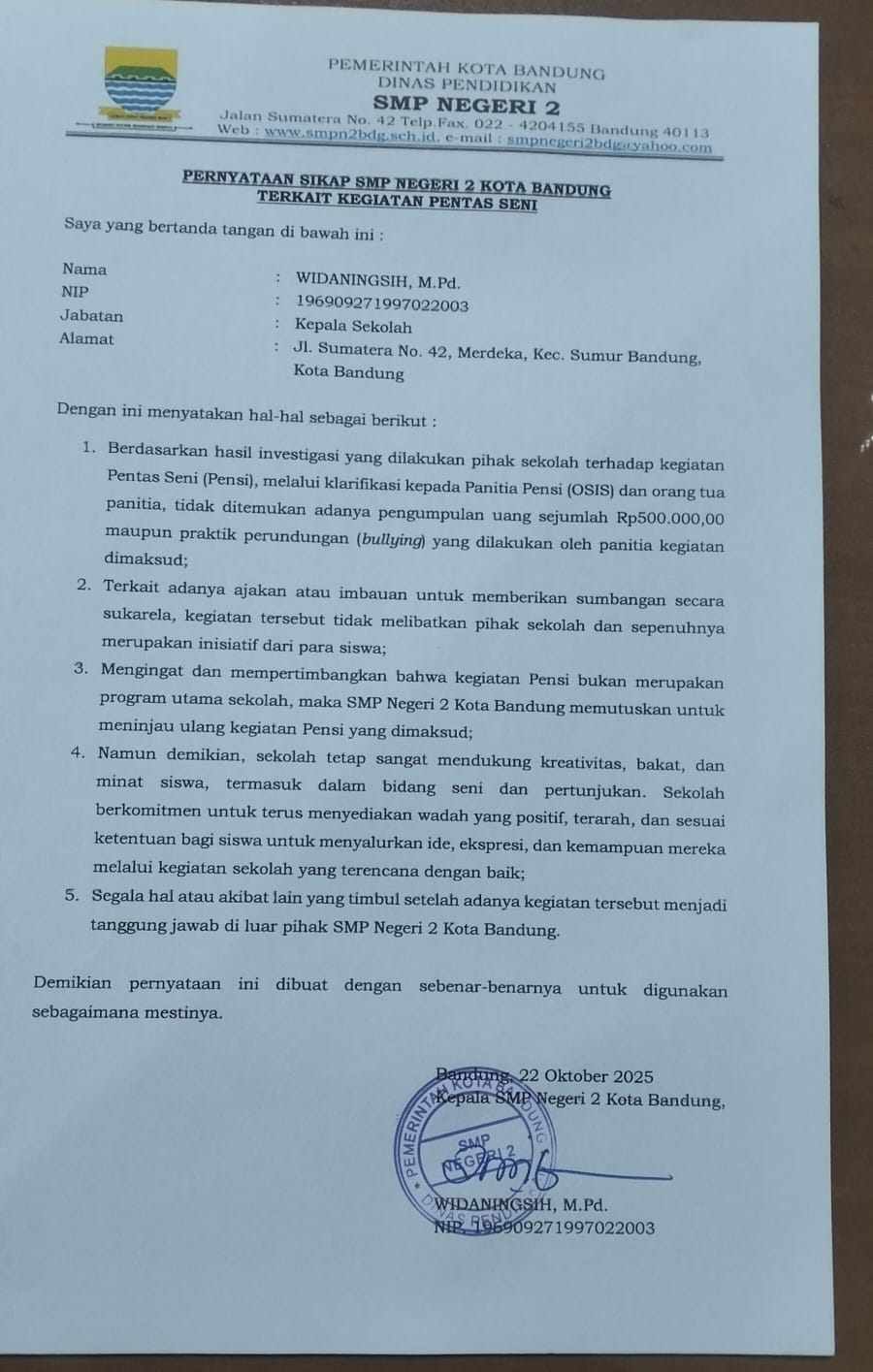 “Mengingat dan mempertimbangkan bahwa kegiatan Pensi bukan merupakan program utama sekolah, maka SMP Negeri 2 Kota Bandung memutuskan untuk meninjau ulang kegiatan Pensi yang dimaksud,” tertulis dalam poin ketiga pernyataan sikap.